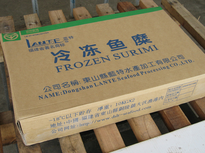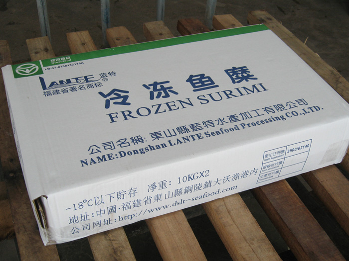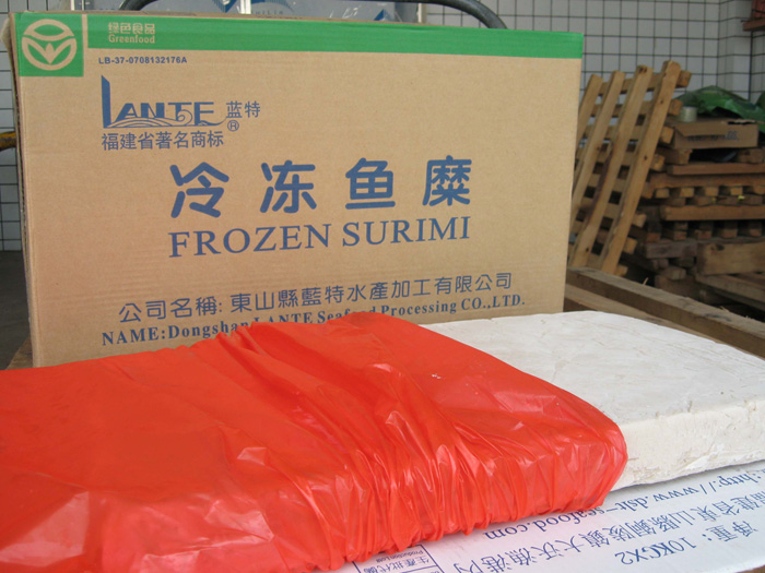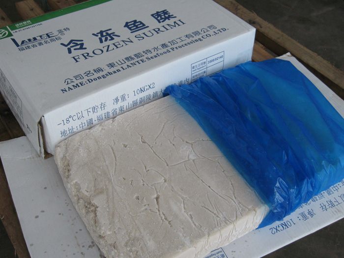 “藍特”牌冷凍魚糜采用天然優質的海洋底層魚類為原料,引進先進的生產設備和工藝技術精制而成,它具有蛋白質含量高,色澤白,夾雜物少,凝膠強度好,組織細膩,耐貯藏,易流通加工等特點,是制造魚糜制品如魚丸、蝦丸、魚糕、魚香腸、蟹柳等產品的理想原料,是一種無污染的生產海鮮食品的優質原料。